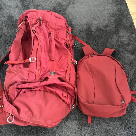 Käyttämätön omavalmisterinkka.Vahvaa puuvillakangasta.Irrotettava vedenpitävä suojahuppu.Mitat. Kork. 65 cm. - leveys. 60 cm. taskuineen. - Syvyys. 25 cm.