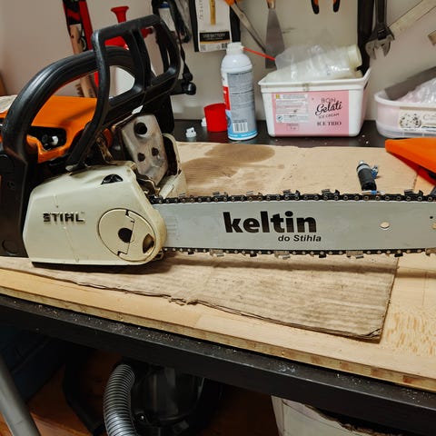 Varustettu 12” laipalla ja Oregonin ketjulla(noin puolivälissä) alkuperäisellä Stihlin sylinterillä ja männällä.