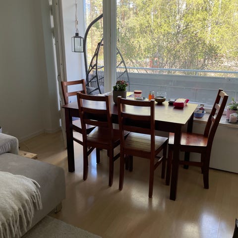 Myydään hyvässä kunnossa oleva ikean pöytä. Tuolit ei parhaimmassa kunnossa, joten ne saa kaupanpäälle.