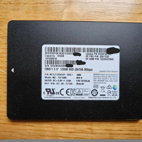 Kingston HyperX Fury SSD-levy, kapasiteetti 120 GB. 2,5 tuuman SATA-SSD, soveltuu esimerkiksi tietokoneen tai kannettavan tallennustilan laajentamiseen tai käyttöjärjestelmälevyksi. Musta kotelo, etiketissä tekniset merkinnät ja sarjanumerot.