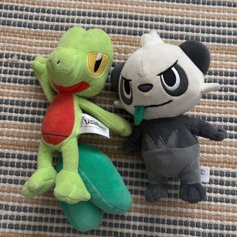 Pokémon Mudkip ja Yamper pehmolelut. Mudkip-pehmolelu on sinisävyinen, jossa on oranssit sivuevät ja vaalea vatsapuoli. Yamper-pehmolelu on kelta-vihreäsävyinen koiramainen hahmo, jossa on vaalea vatsapuoli ja korostevärit korvissa ja selässä. Pehmolelut sopivat esimerkiksi leikkeihin tai koristeeksi. Materiaali on pehmeää kangasta ja täytettä, koko n. 30cm