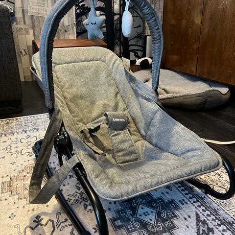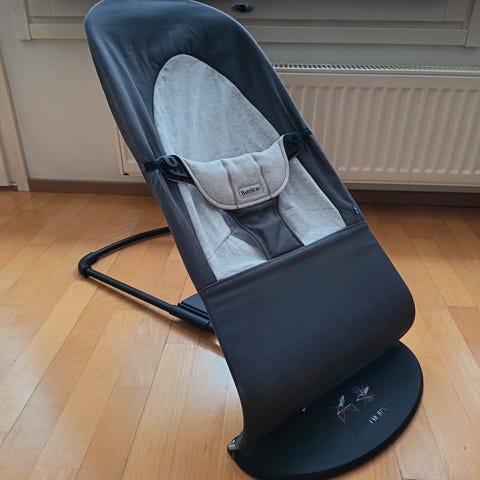BabyBjörnin harmaanvärinen sitteri. Kangas hieman pesussa ja käytössä haalistunut, mutta muuten täysin ehjä ja toimiva istuin vauvalle. Ei altistunut tupakoinnille tai lemmikeille.