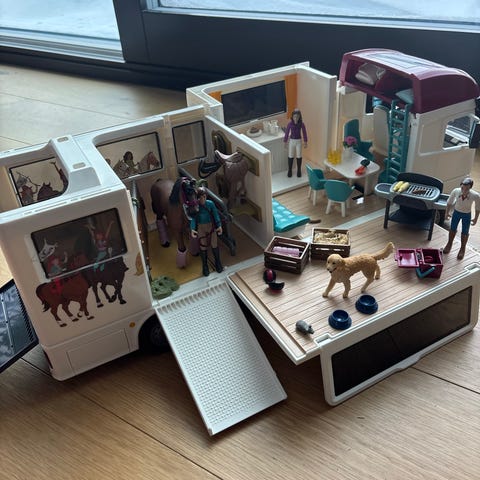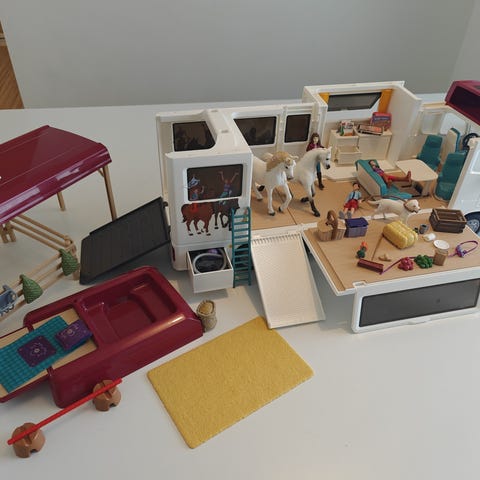 Schleich rekka + tarvikkeet. Avattavat sivuovet, rampit ja luukuy, sekä katto. Sisällä on hevosten karsinat, oleskelutila ja ohjaamo. Mukana erilaisia tarvikkeita, kuten aitauselementtejä, esteitä, ruoka- ja hoitotarvikkeita, satulat, riimut, suitset, huovat, sohva, grilli, taso, tuoli, sekä muita pieniä irto-osia ja kaksi ihmistä. Soveltuu hevoshahmojen ja talliympäristön leikkeihin muiden Schleich-hevos- ja tallisarjan tuotteiden kanssa.