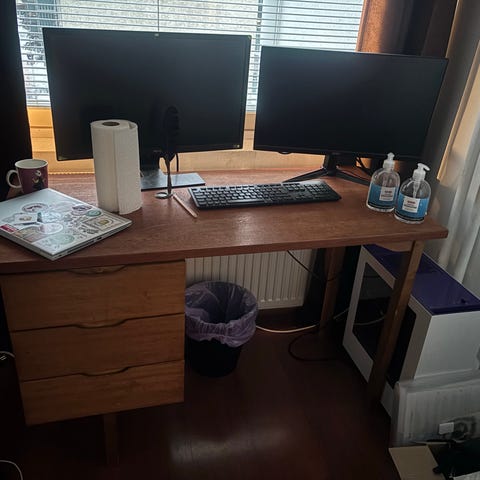 Valkoinen/Koivu työpöytä. Pöydän toisella sivulla on kaappi hyllyllä ja ovella, toisella sivulla laatikosto kolmella vetolaatikolla. Metallin väriset vetimet. Pöydän alla jalkatila noin 58cm. Soveltuu työpöydäksi tai opiskelupöydäksi kotiin. Alimman laatikon vasemmassa yläkulmassa pieni melkein huomaamaton kolhu. Pelkästään nouto.