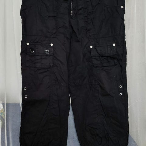 Pitkät musta cargo-housut, M koko, pituus n. 98cm, taskuja sivussa, joustava vyötärö, taskut polvien kohdalla,