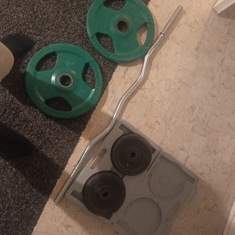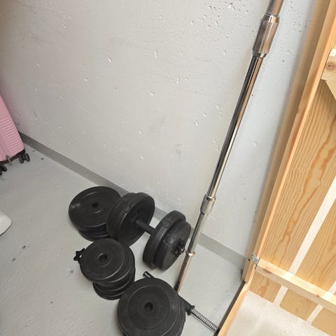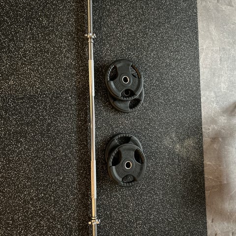 York Barbell ja Gymstick levypainot sekä tanko ja lukot. Kuvatun setin levypainot sopivat levytankoon, jossa on vastaava reiän halkaisija (mukana). Mukana useita York Barbell -merkkisiä kultaisia levypainoja sekä kaksi mustaa 10 kg Gymstick-levypainoa.