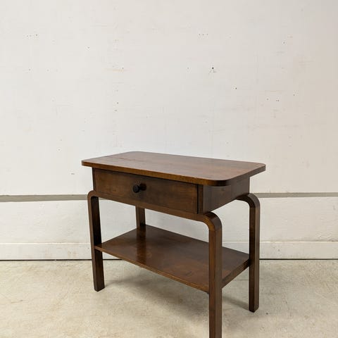 Funkkis tyylin 30/40-luvun lipasto / sivupöytä myytävänä. Kannessa kuvan mukaista jälkeä. Muilta osin kunto hyvä ja rakenne tukeva. Vetolaatikko toimii. Ei hajuja.