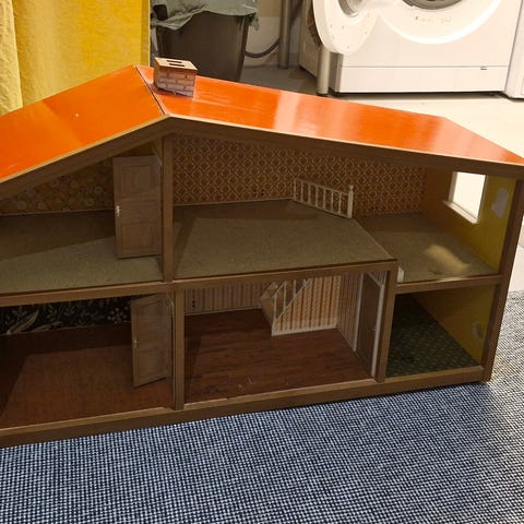 Nukkekoti joissa leikin jälkiä, hissi toimii. Muutama kaluste mukaan.