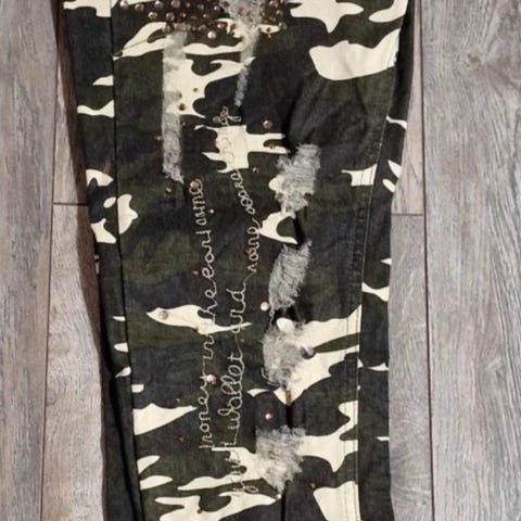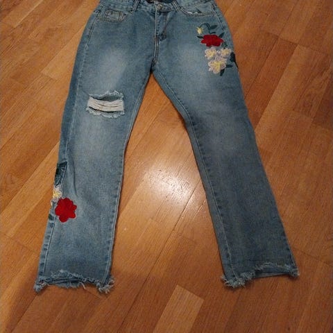 Koristeelliset blingbling farkut. Reikiä, pitsiä, kuluma-efektejä. Puuvillaa, polyesteriä, elastaania. Vyötärön ympärys 86 cm, lahkeen sisämitta 76 cm. Annan mielelläni lisää mittoja.
