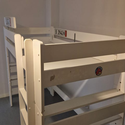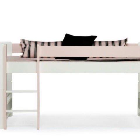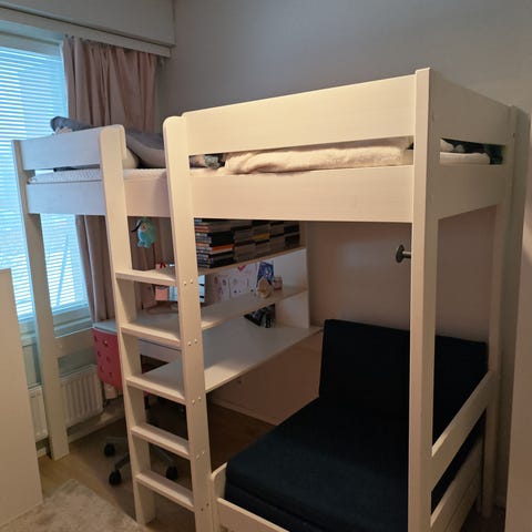 Kuvissa näkyy erillinen valkoinen hyllykkö- ja pöytätaso, joka sijoittuu sängyn alle tarvittaessa piiloon. Soveltuu lapselle, joka nukkuu jo omassa sängyssä ja osaa kulkea tikkaita turvallisesti.