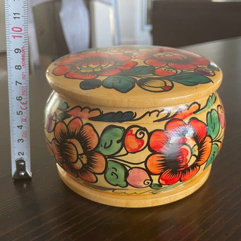 Puinen pieni arkku 50-60-luvulta, jossa monikulmainen muoto ja koristeelliset kuviot sivuilla. Rasiassa on saranoitu kansi ja pieni nuppi avaamista varten. Reunat on viimeistelty pitsimäisellä nauhalla. Sopii esimerkiksi korujen, pienten esineiden tai muistojen säilytykseen. Leveys 36 cm, korkeus 13 cm.