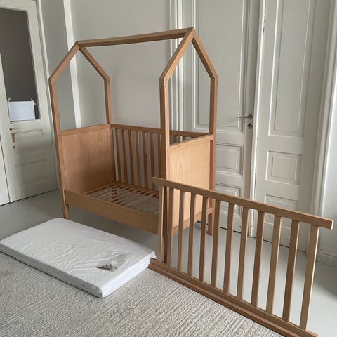 Ollut yhdellä lapsella ja tosi siistissä kunnossa, ei näkyviä kolhuja tai vaurioita maalipinnassa. Sopii vauvan ja pienen lapsen nukkumiseen, koska myös pohja on säädettävissä kolmeen eri korkeuteen.
