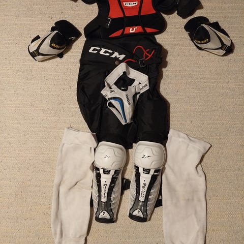 Siinä olisi innokkaalle nuorelle harrastajalle hyvässä kunnossa olevat jääkiekko varusteet kassin kanssa. Varusteita on käytetty mutta hyvässä kunnossa silti