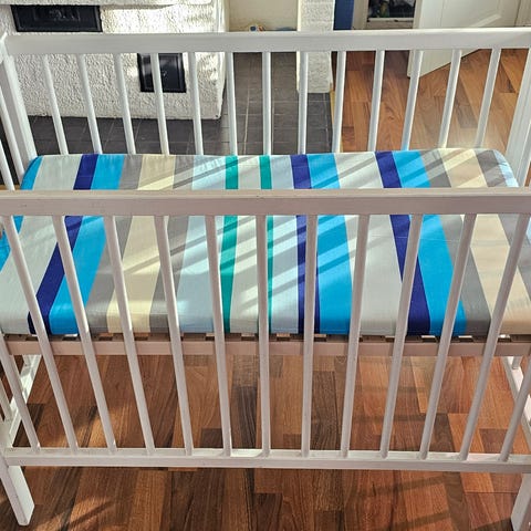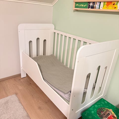 Tukeva valkoiseksi maalattu pinnasänky, lapsi nakertanut laitoja kuten kuvasta näkyy. Pohjan saa kolmeen eri korkeuteen ja toisen laidan laskettua alas. Siisti IKEA:n patja, reunapehmuste, lakanoita. Myydään pakettina. Hukanhaudalla.