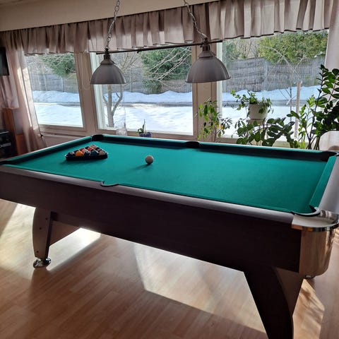 Biljardipöytä pelivälineillä. Ei ole uusi mutta hyväkuntoinen. Ei ole virallisen pöydän kokoinen. Leveys 205 cm, pelikentän leveys 180 cm. Syvyys 115 cm, pelikentän syvyys 90 cm. Korkeus 89 cm. Pelikangas ehjä, hieman kulunut ja pohja suora. Saadaksemme pöydän ulos ovesta on jalat irroitettava, kiinni ruuveilla (helpottaa myös kuljetusta, on painava).