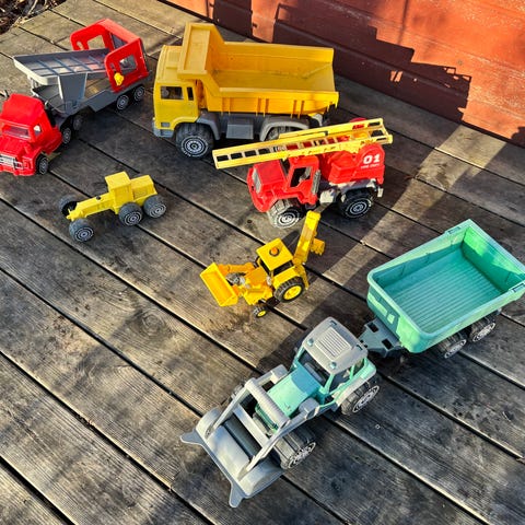 6 kappaletta Plaston leluautoja. Käytön tuomaa jälkiä ja kulumaa. Yhdestä autosta on kauhan toinen kiinnike murtunut ja muut on ehjiä.
