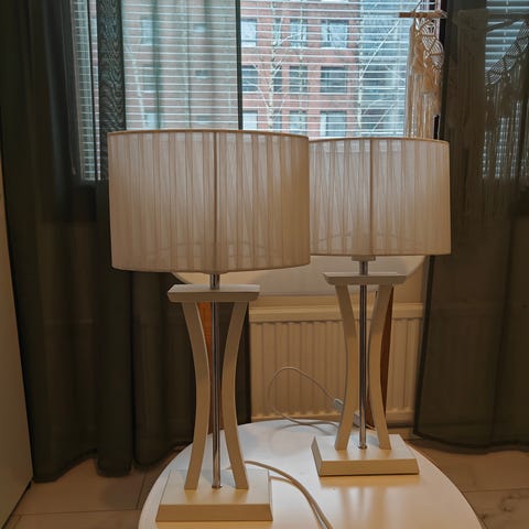 Vaaleat pöytälamput 2 kpl. Mitat varjostin 30cm x 30cm. Korkeus 60cm.