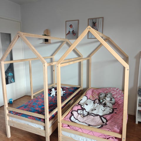 Hyvässä kunnossa oleva talosänky 70x160 cm verholla. Koottaessa tuli pientä vauriota, joista yksi näkyy kuvassa. Myyntiin kuitenkin suoraan käytöstä ja on palvellut hyvin. Nyt isomman sängyn tieltä pois. Sänkyyn hankittu verho on alkuperäinen Hoppekids-verho ja kuuluu juuri tähän sänkyyn. Patja on ollu käytössä n. vuoden. Aina käytetty patjansuojusta ja vahinkoja ei ole sattunut. Sen saa halutessaan mukaan. Tarjoan mukaan myös junior-koon peiton ja pari pussilakanaa, sekä patjaan sopivat muotoon ommellut trikoiset aluslakanat. Paras on jos voit hakea isommalla autolla, eikä sänkyä tarvitsisi laittaa ihan paloiksi. Kokoamisohjetta ei löydy. Sängyn hinta uutena tällä hetkellä hoppekidsin sivuilla 361€ ja verhon 185€. Ostaja purkaa ja kuljettaa pois. Voin auttaa kantamaan. Talossa on hissi. Taloudessamme on kissa, otathan tämän huomioon etenkin tekstiilien kanssa.