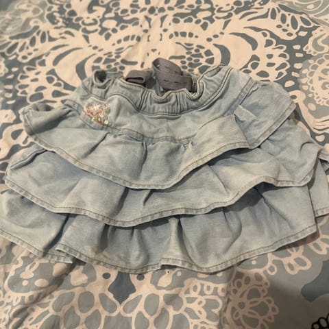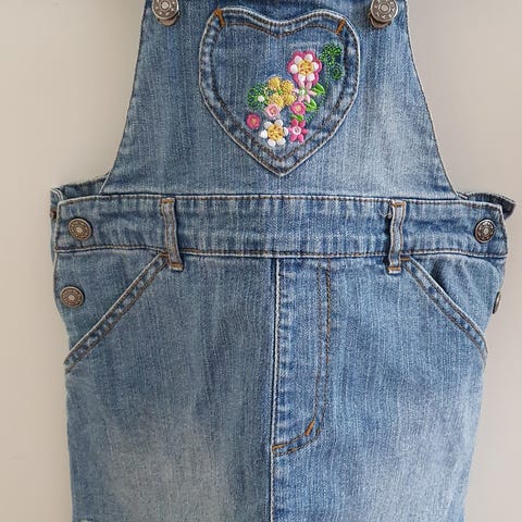 H&M farkkuhame, koko 92. Sininen denim-materiaali. Edessä tasku, jossa kuvitus. Vyötäröllä nappikiinnitys.