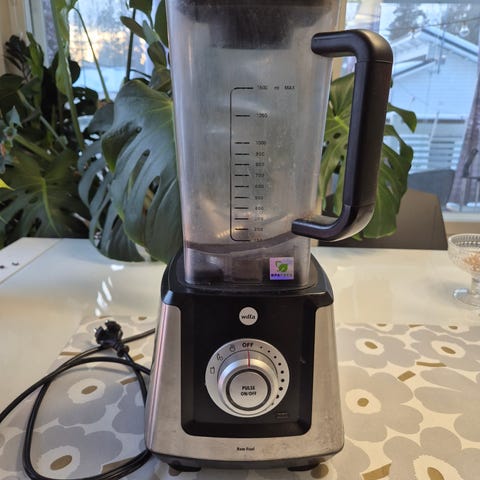 Wilfa tehosekoitin lasikannulla. Laitteessa on teräksinen runko ja läpinäkyvä, mitta-asteikolla varustettu lasikannu. Etuosassa on pyöritettävä säätönuppi, josta voi valita eri nopeusasetuksia ja mahdollisen pulssitoiminnon. Sopii esimerkiksi smoothieiden, keittojen ja kastikkeiden sekoittamiseen sekä jääpalojen murskaamiseen kannun ja terien kestävyyden puitteissa.