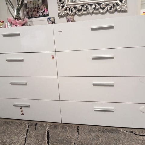 Kuusi tilavaa vetolaatikkoa. Laatikoiden pohjat asennettu vahingossa väärä puoli ylöspäin. Saa korjattua/käännettyä, jos itse haluaa.