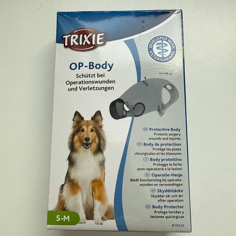 Koiran haavapuku leikkauksen jälkeen keskikokoiselle koiralle. Puvussa koko L, mutta mielestäni on M kokoinen.