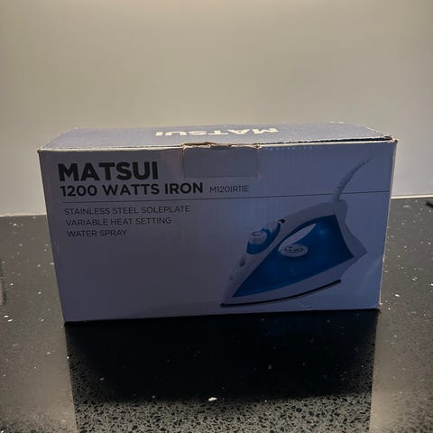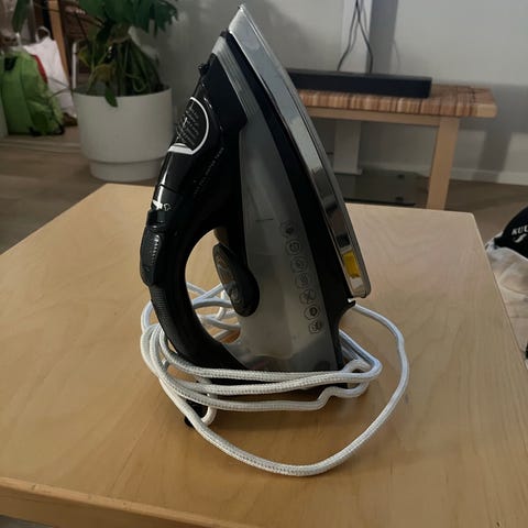 Clas Ohlson höyrysilitysrauta. Väriltään sinivalkoinen, varustettu höyrytoiminnolla ja veden täyttösäiliöllä. Pohjalevy on pinnoitettu tasaisen lämmön jakautumisen helpottamiseksi. Virtajohto onkangaspäällyste