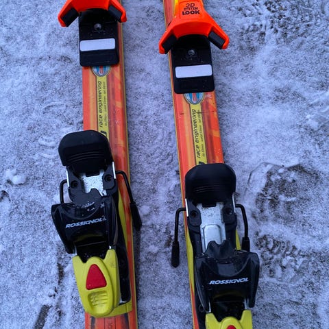 Fischer laskettelusukset siteillä. Sukset ovat punaiset, Soveltuvat rinnelaskuun.