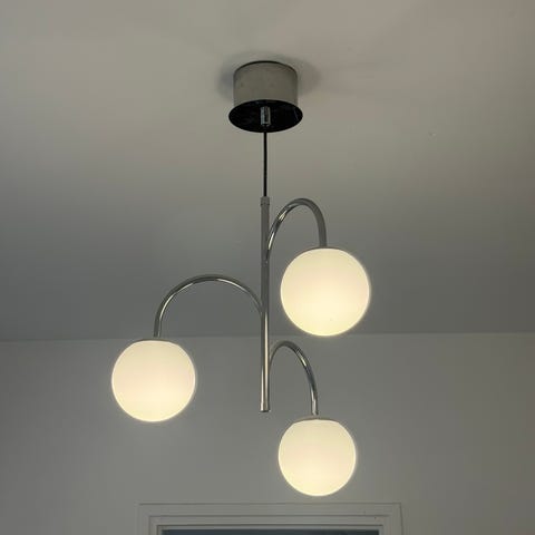 Ikea SIMRISHAMN Pöytävalaisin, kromattu/opaalinvalkoinen lasi, 42 cm. Mukaan tulee polttimot (kupujen sisällä valmiina). Maitolasissa jotain kolhuja seinästä, en ole kokeillut putsata.