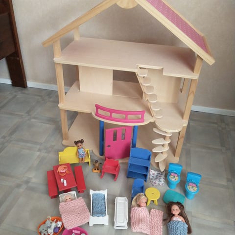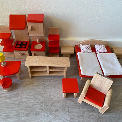 Myydään setti nukkekodin tai hahmojen kalusteita. Setti sisältää sänkyjä, pöytiä, sohvia, wc ja kulpyhuonekalusteita jne.