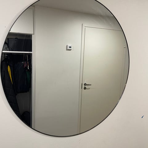 Myydään Jysk pyöreä peili, jossa kapea musta metallireuna. Peili on seinälle ripustettava ja sen taustassa on tukirakenteet kiinnitystä varten. Sopii käytettäväksi esimerkiksi eteisessä, makuuhuoneessa tai olohuoneessa sisustuselementtinä ja pukeutumispeilinä.