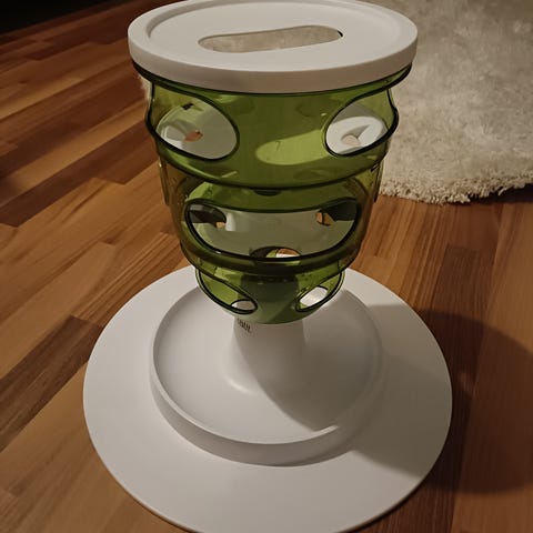 Kuvan mukainen aktivointilelu kissalle. Harjoittaa kissan älykkyyttä ja vähentää ahmimista. Oma kissa ei oikein innostunut joten myydään pois. https://www.mustijamirri.fi/catit-senses-20-food-tree