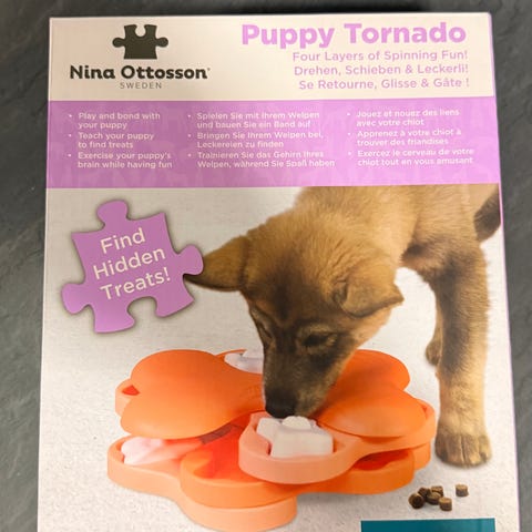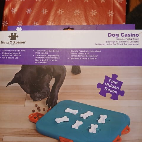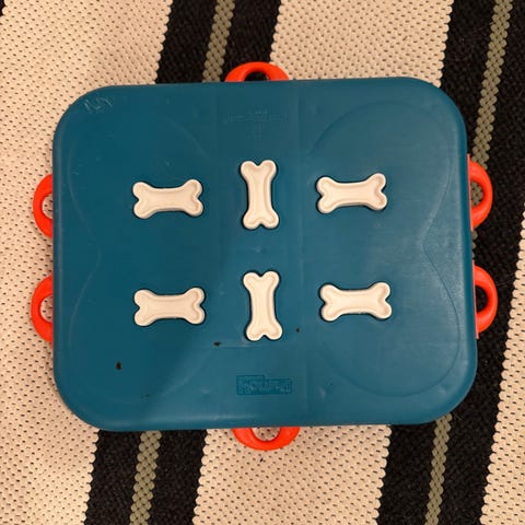 Koiran älypeli. Ei ole purtu tms. Liikkuvissa osissa jälkiä kynsistä. Täysin ehjä.
