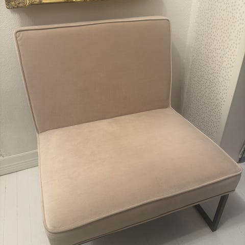 No brand nojatuoli punainen sametti. Nojatuolissa on tummanpunainen samettipäällinen ja pehmustettu istuin sekä selkänoja. Käsinojat ovat pyöristetyt ja tuolissa on puujalat. Sopii esimerkiksi olohuoneeseen tai lukunurkkaukseen istuimeksi ja rentoutumiseen.