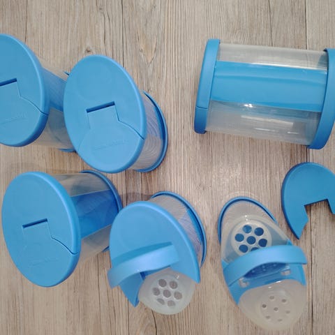 Tupperware veitsen teroitin sekä mekaaninen purkinavaaja keittiökäyttöön. Purkinavaajassa on ergonominen kahva ja metallinen avausmekanismi.