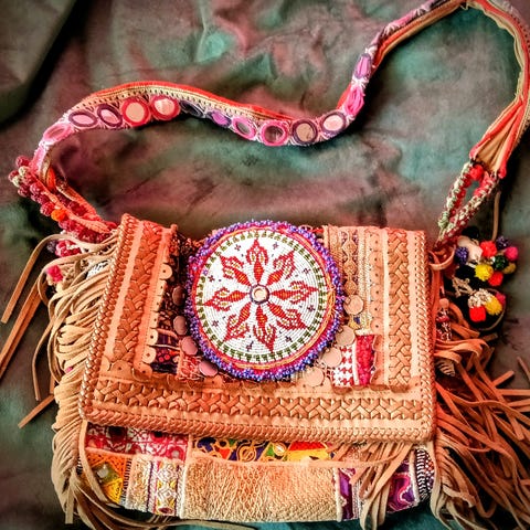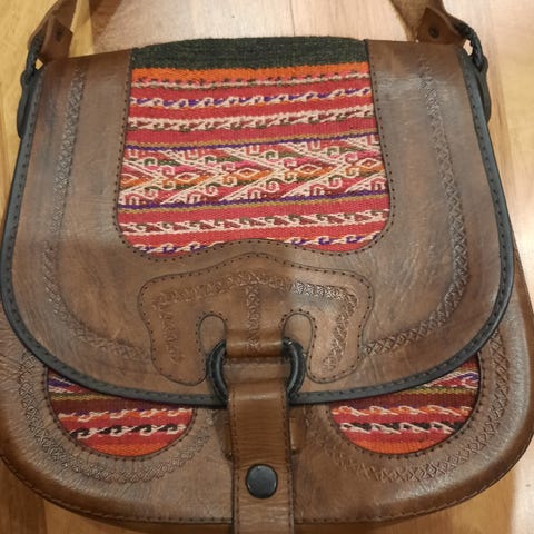 Myydään erittäin kaunis ja persoonallinen, Intiasta hankittu olkalaukku. Laukku on valmistettu taitavasti kutomalla, mikä tekee siitä kevyen ja antaa sille upean eläväisen pinnan. Violetin sävyjä täydentävät näyttävät vaaleat koristeompeleet, jotka tuovat laukkuun laadukkaan ja eksoottisen säväyksen.