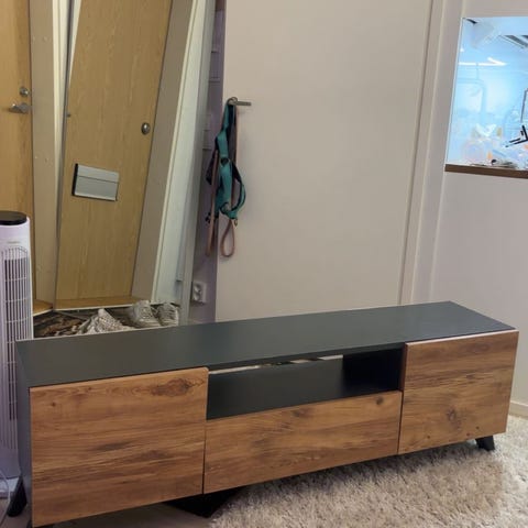Hyvässä kunnossa oleva korkeakiiltoinen TV-taso.