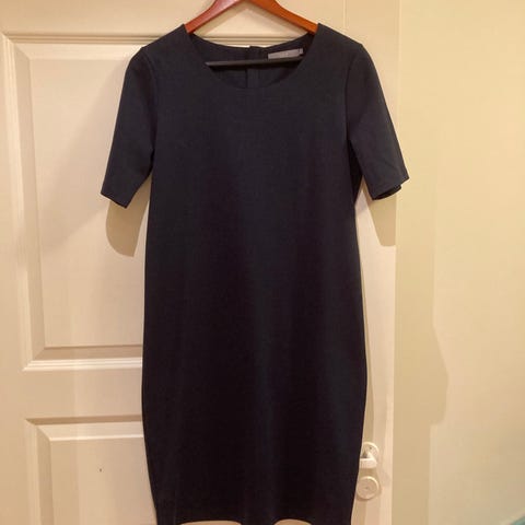 Musta-valko-purppura kotelomekko, joustavaa kangasta. Koko M. Hyväkuntoinen, takana pitkä vetoketju.