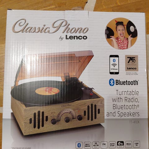 Lencon näppärä vinyylisoitin/radio, jolla onnistuu myös Bluetoothin kautta musiikin kuuntelu vaikka omasta puhelimesta. Helppokäyttöinen ja kevyt. Toimiva ja kaikinpuolin ehjä.