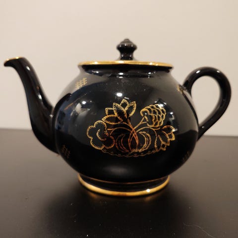 Ehyet astiat. Teekannu teesihdillä, Kolme kuppia joista kahdessa kuvio himmeämpi. Kolme lautasta joista yksi erilainen.