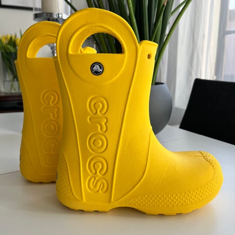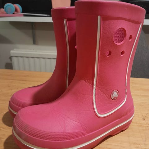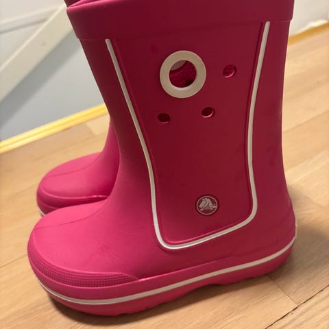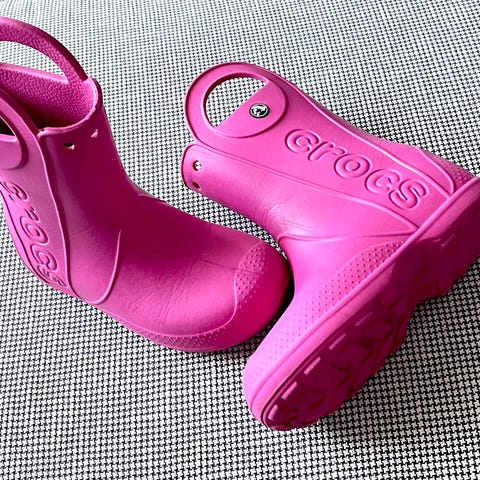 Crocs lasten kumisaappaat, koko J1 (EU 32-33). Unisex-malli. Saappaissa on vaaleanpunainen kuminen alaosa ja tummemman pinkki varsi tekstiilimateriaalista. Varsi suljetaan tarrakiinnityksellä sivulta. Pohjassa on karkea kuviointi paremman pidon takaamiseksi. Soveltuvat viileään säähän ja ulkoleikkeihin.