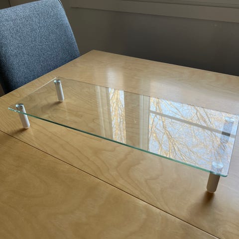 Lasinen koroketaso, jossa neljä valkoista jalkaa. Tasossa on suorakaiteen muotoinen kirkas lasilevy ja metallikiinnitteiset jalat, jotka nostavat tason pöydän pinnasta useamman senttimetrin. Sopii esimerkiksi näytön, kaiuttimien tai muiden pienten laitteiden ja esineiden korokkeeksi työpöydälle tai tasolle. Mitat näkyvät kuvissa mittanauhan avulla (pituus, leveys ja korkeus).