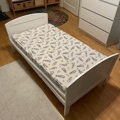 Soveltuu hyvin pienelle lapselle pinnasängyn jälkeen. Itsellämme lapsi siirtyi tähän n. 1,5 vuotiaana. Erillisen laitasuojan saa helposti asennettua. Muutamia jälkiä saattaa olla.