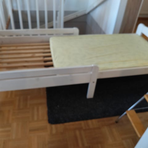 Myydään juniorisänky. Sängyssä on molemmilla sivuilla laidat, jotka auttavat lasta pysymään sängyssä. Runko on puinen ja pohjana on sälepohja. Sopii siirtymävaiheen sängyksi pinnasängystä isompaan sänkyyn.