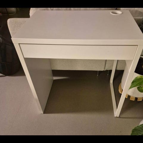 Valkoinen työpöytä. Pöydässä on pieniä käytönjälkiä / kulumaa kuten kuvassa 2 näkyy. Laatikot toimii täydellisesti ja muuten pöytä loistavassa kunnossa! Mahdollisuus piilottaa johdot ja virittää ne takaosassa olevasta luukusta (kuva 4)😊