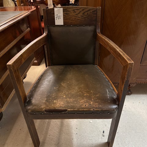 Tummaa puuta oleva tukeva tuoli, jossa hyvä istua. Istumakorkeus 52 cm. Vasemmassa käsinojassa hieman kulumaa.