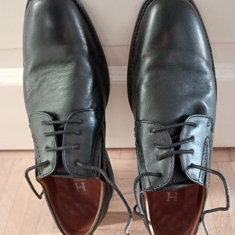 Miesten mustat täysnahkaiset juhlakengät. Ostettu Turun Stockmannilta. Merkki kulunut pois. Koko 43.
