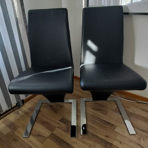 Annetaan kolme valkoista ruokatuolia. Kulumaa löytyy, mutta muuten ovat ehjiä.