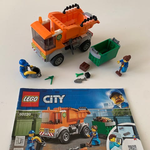 LEGO City jäteauto, jossa on kippitoiminto ja takalastaus, sekä roskapönttö kannella, pieniä palikoita roskiksi ja yksi minihahmo työvarusteineen (mm. lapio ja nostokärry).