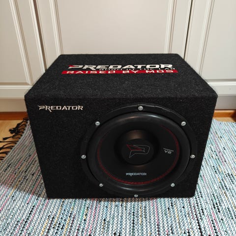 Myyntiin varalla pyörinyt bassosetti. Elementti siis dynamicsin spl sarjalainen johon laitettu autostudio ref12d2spl recone ja remontin jälkeen ollut ehkä 2kk käytössä. Kotelo 32mm vanteria, mitat luokkaa 92cm levee, 40cm korkee ja 40cm syvä. Varmasti riitttävän tukeva, litrat 80 paikkeilla ja viri jotain 40hz eli passeli normimusiikkiin eikä niinkään löröttelyyn.
